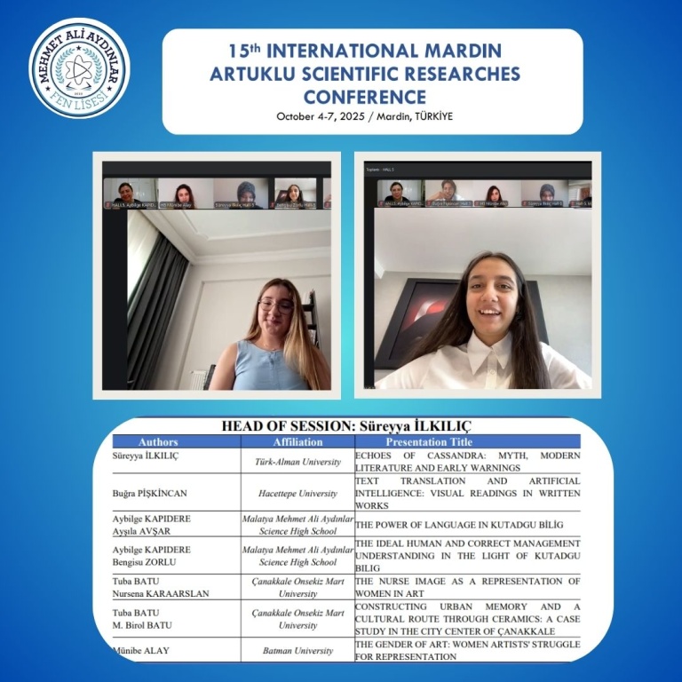 04–07 Ekim 2025 tarihlerinde Mardin’de düzenlenen 15. Uluslararası Mardin Artuklu Bilimsel Araştırmalar Kongresi’ nde öğrencilerimiz Ayşıla Avşar ve Bengisu Zorlu , Türk Dili ve Edebiyatı öğretmenimiz Aybilge Kapıdere danışmanlığında bildirilerini sundular.