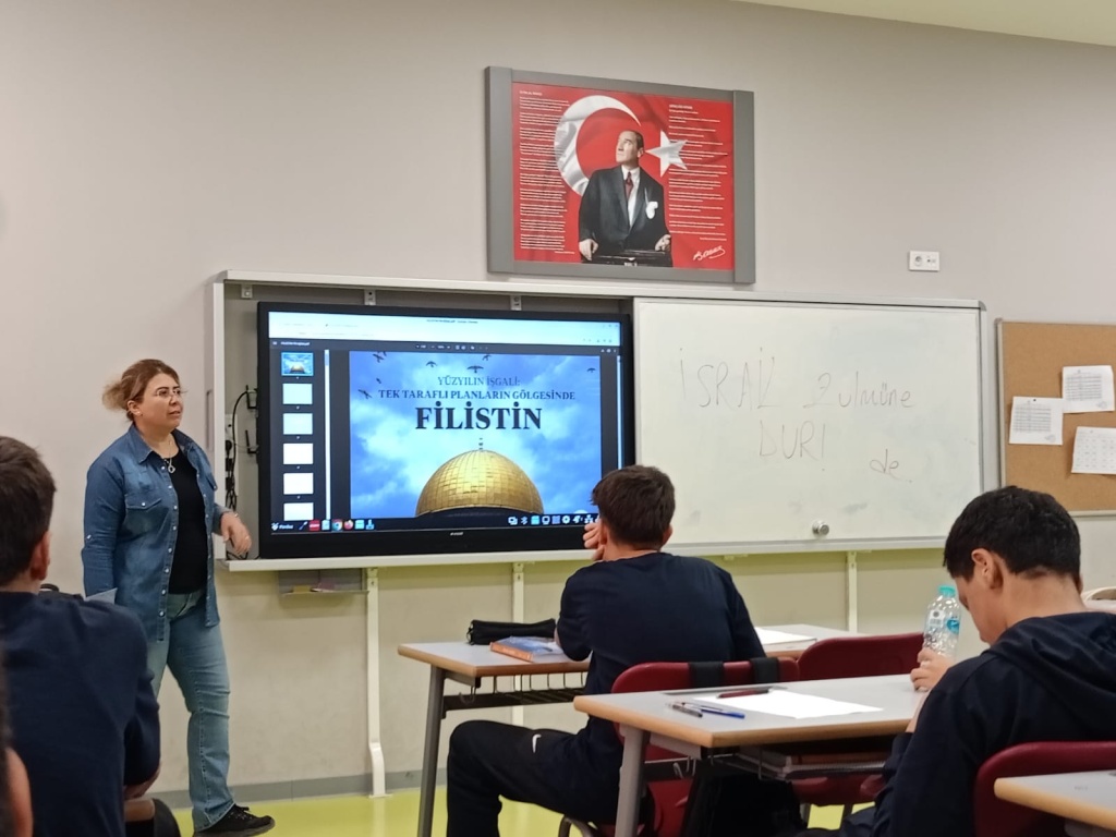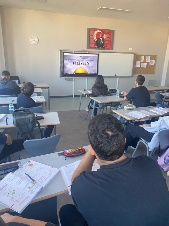 07 Ekim 2025 Salı günü öğrencilerimizin ilk dersi Filistin Farkındalığıydı. Her sınıfta Filistinde yaşanan drama dikkat çekildi. Dersin akabinde okulumuz konferans salonunda öğrencilerimize yönelik Filistin farkındalık etkinliği gerçekleştirildi. Etkinlikte, Filistin’de yaşanan insani drama dikkat çekilerek öğrencilerde duyarlılık oluşturulması amaçlandı. Program, Din Kültürü ve Ahlak Bilgisi öğretmenimiz Süleyman GÜRSÜ'nun yaptığı konuşmayla başladı. Ardından okulumuz öğrencileri tarafından hazırlanan ve Filistin Bayrağı ile Filisitin halkının özgürlüğü için destek videosu çekildi.