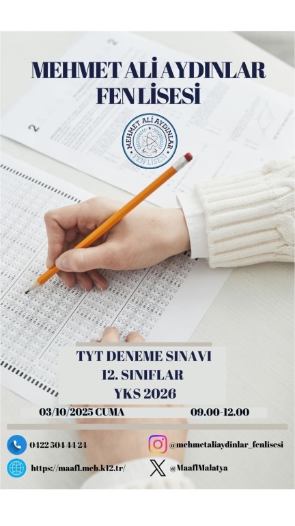 12. Sınıf öğrencilerimize yönelik 03.10.2025 Cuma günü "1. TYT Deneme Sınavı" yapılacaktır.